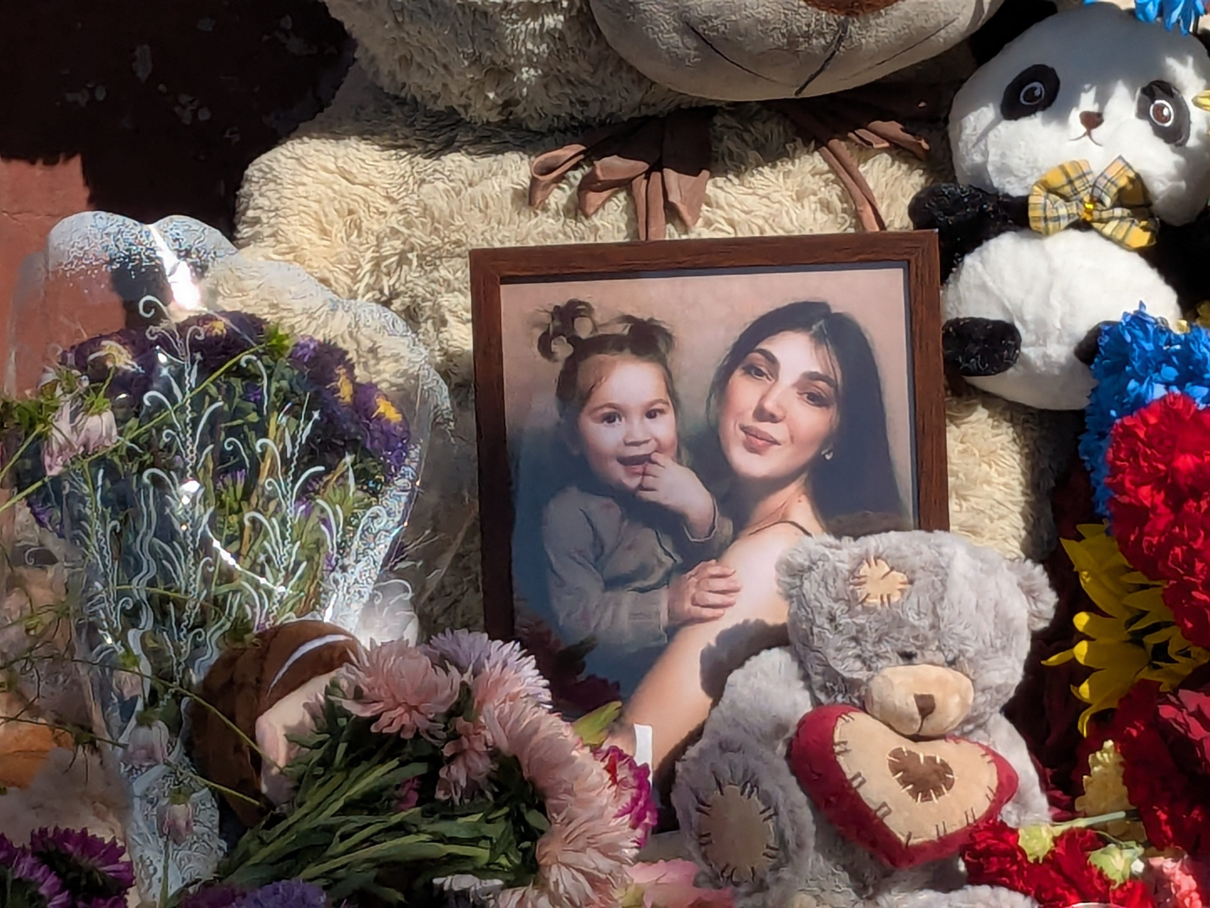 A photo of Nadiia Halych and her daughter, Anhelina, nestles within a makeshift shrine outside the Kyiv apartment building where they died in a Russian missile attack early Thursday. (c. Martin Kuz)