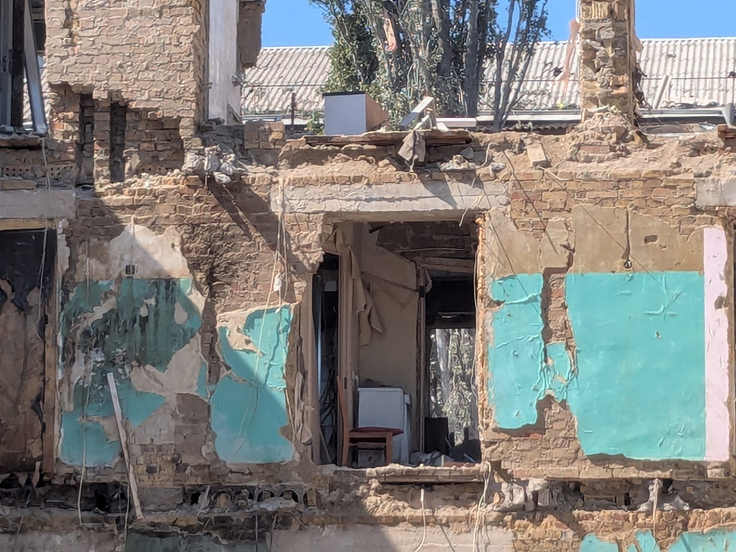 The missile cut deep gashes in the building, revealing remnants of lives now past: a stove, a desk, a sofa, a toilet. A pump bottle of lotion rested on a table, a framed certificate hung on a wall. An internal stairwell stood open to the sun, and missing doors and windows created sightlines straight through the building. The people had vanished. Only emptiness remained.