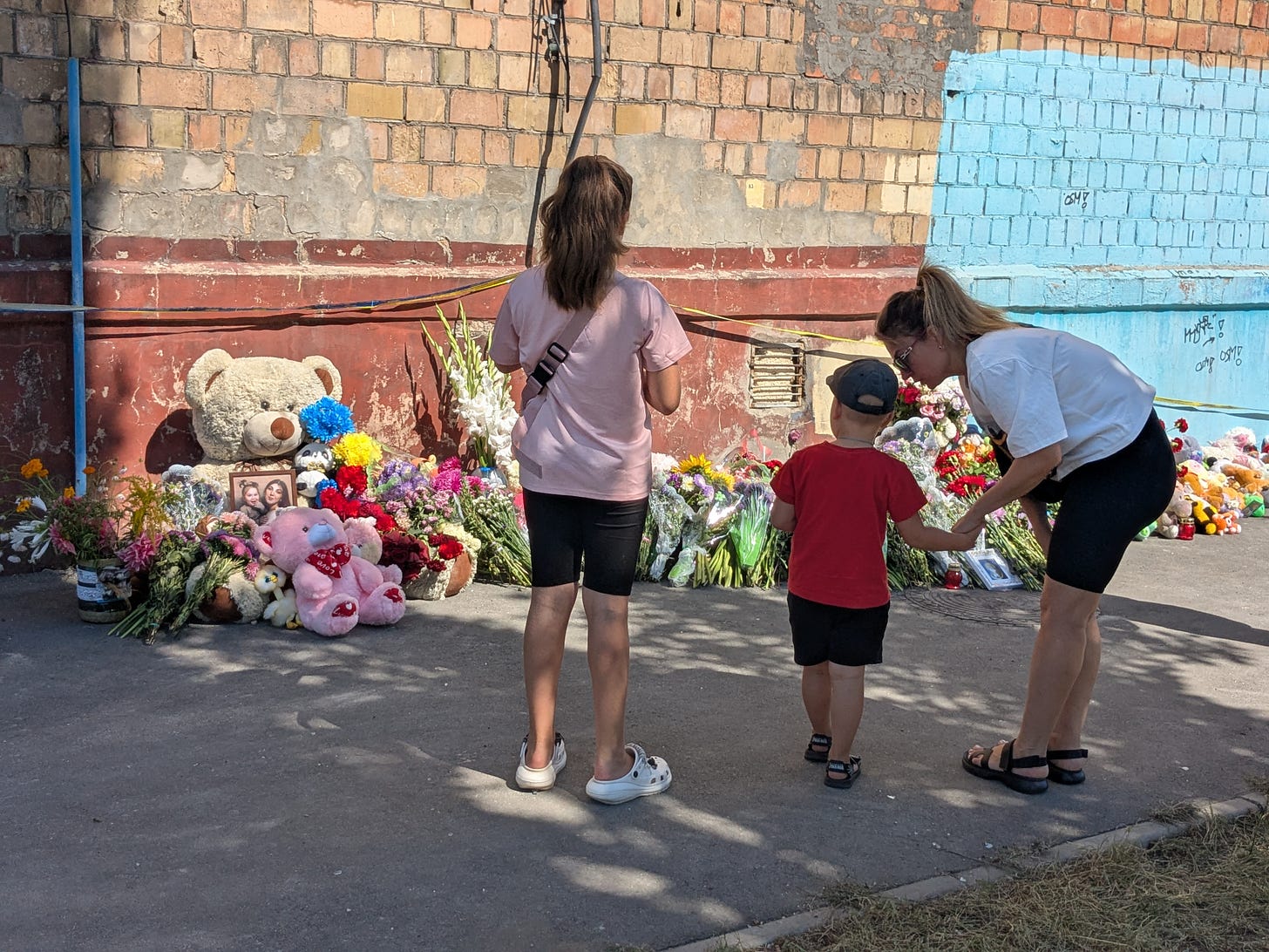 The cleanup that began hours after the airstrike continued Saturday afternoon, when I visited the site. A makeshift shrine of flowers, stuffed animals, candles and other offerings covered the base of an external wall. Friends, neighbors and strangers clustered in silence, in sorrow. Nadiia and Anhelina peered back from a framed photo nestled beneath a teddy bear, faces aglow.